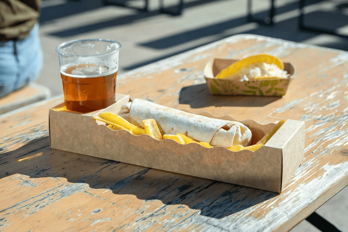 Kraft kutija s nosačem za čaše, 310x90x50mm 100% biorazgradivi patentirani materijal Otporno na masnoće Prikladno za toplu i hladnu hranu Jedostavno slaganje iz jednog poteza